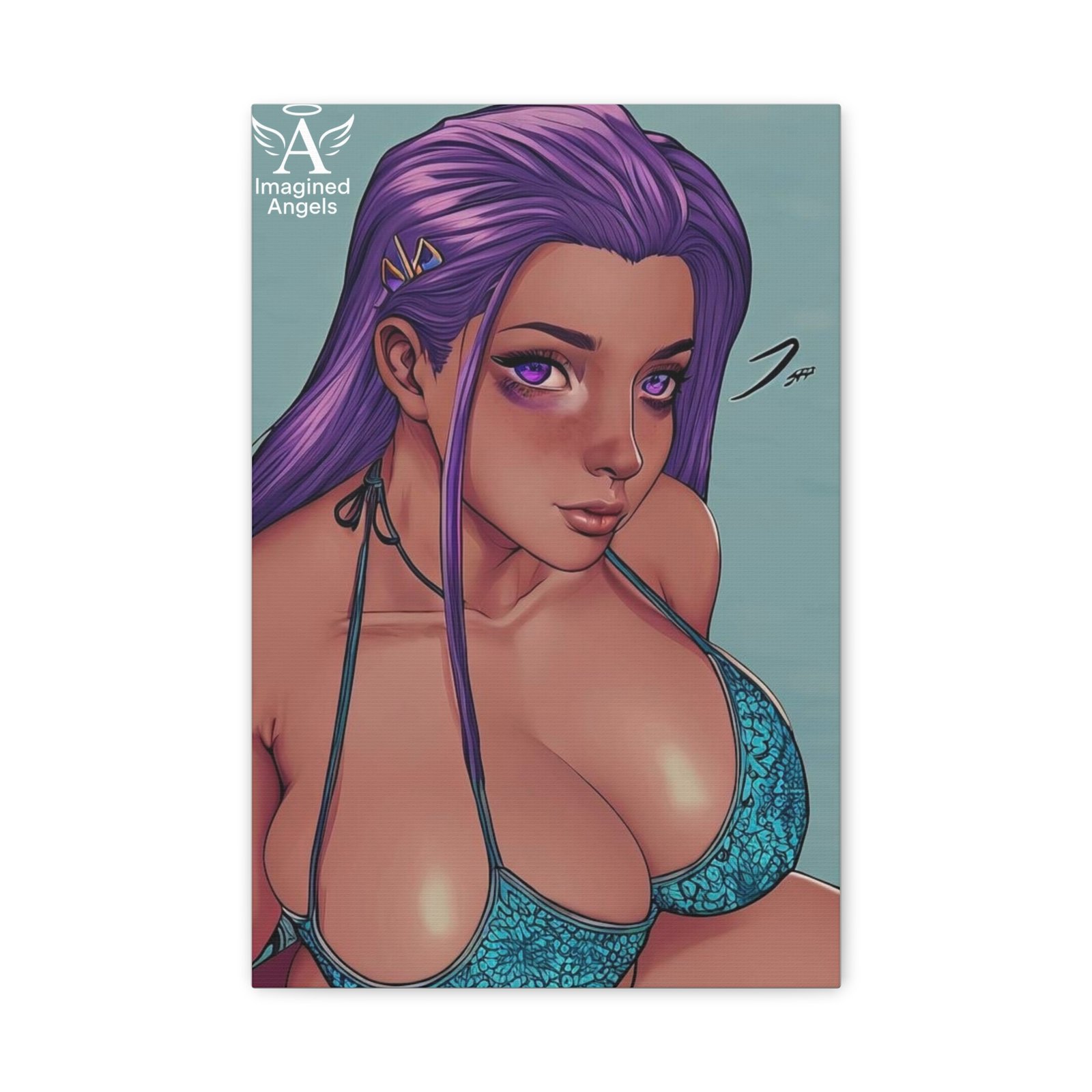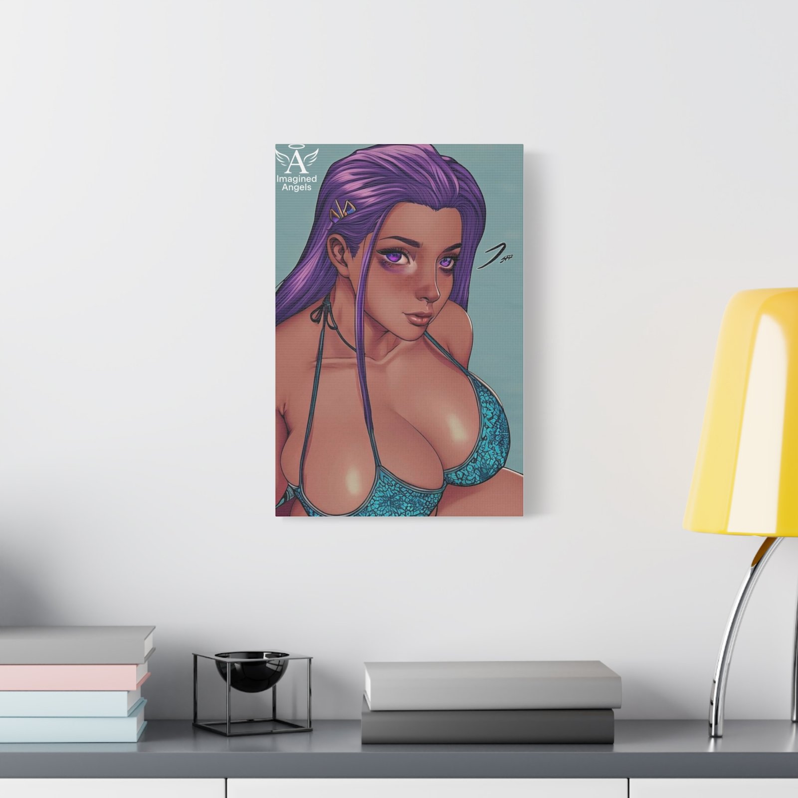 This stretched matte canvas brings a bold, intimate illustration to life with rich, true-to-art color and a soft, gallery-ready finish. Printed with UL-certified Greenguard Gold latex inks on a cotton-poly canvas and stretched over responsibly sourced radiata pine, the piece hangs flush with included back-hanging hardware and stays steady thanks to soft rubber dots on the bottom corners. The matte coating reduces glare so fine linework and skin tones remain detailed and natural — a quiet focal point for a bedroom, studio, or curated art wall. Available in many orientations and sizes to suit tight spots or larger displays; slight size tolerance applies due to handcrafted stretching.